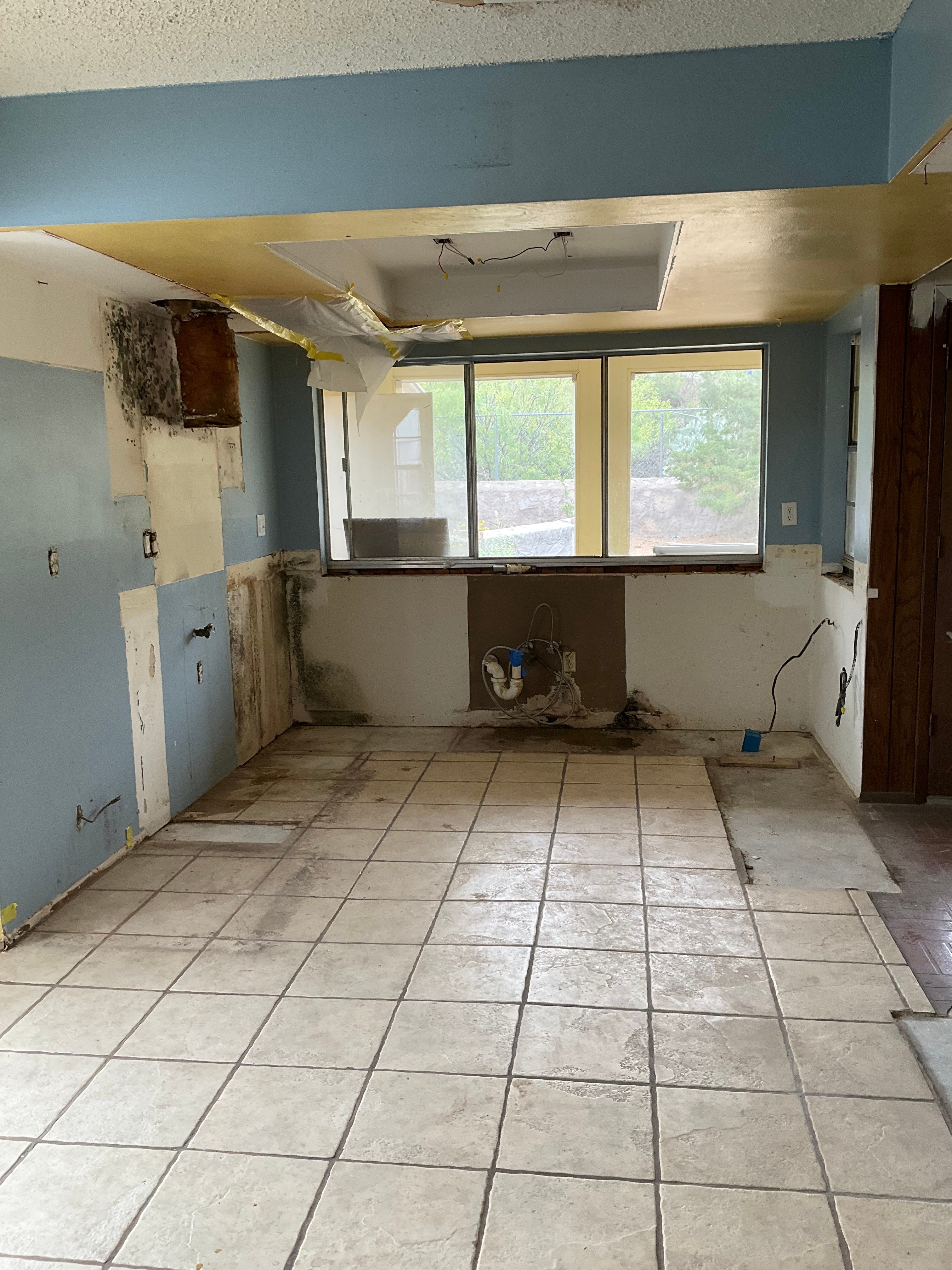 By the time we noticed it the walls and ceiling were full of water and threatening to burst overhead. We had our plumber come and shut it all off as quickly as we could. The kitchen was rendered unusable at this point. It immediately started to develop mold and a rather strong mildew smell. With my allergies I could not be in the house very long at a time so we opted to move to the trailer while we worked through the process.